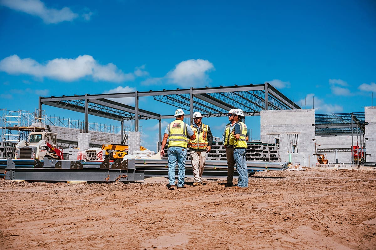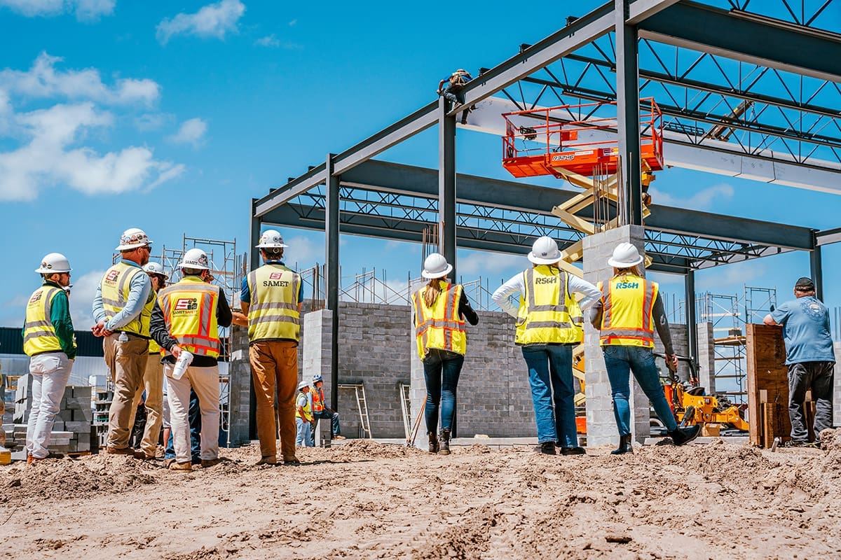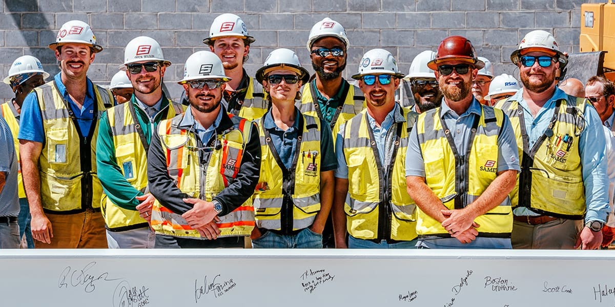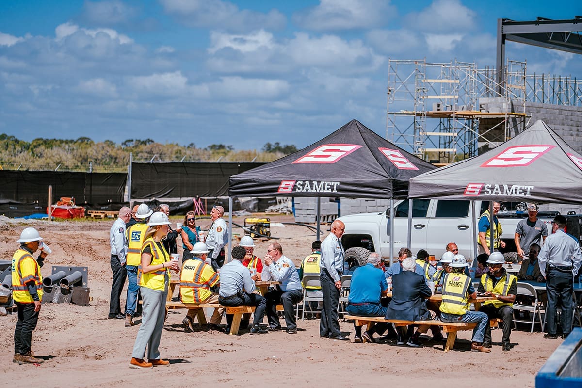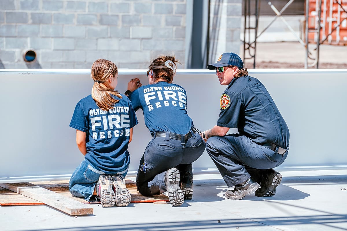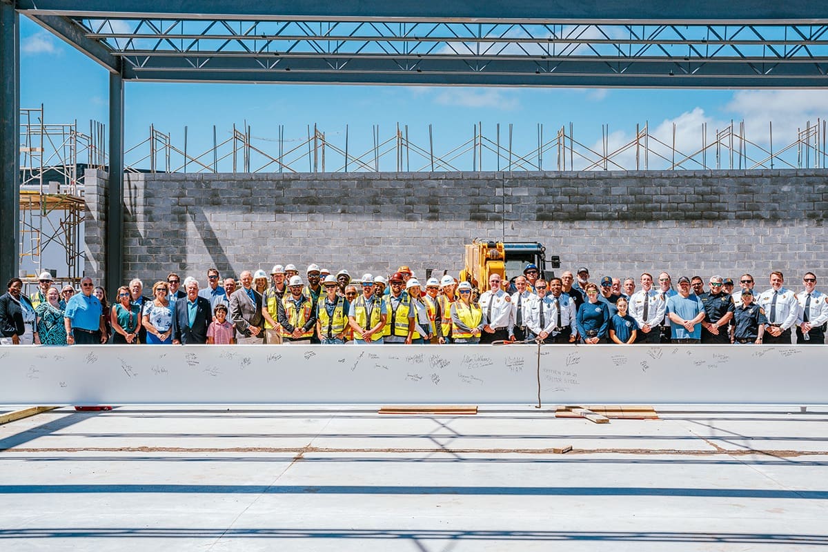 The topping out ceremony brought together the Samet team, Glynn County Fire Rescue personnel, and project partners to sign the final beam before it was raised into place — a tradition that marks the placement of the last structural member and honors everyone who has worked to bring the project to this point.